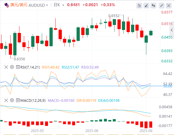 6月24日,澳元/美元周二上涨,连续第二个交易日扩大涨幅。在美国总统唐纳德·特朗普表示伊朗和以色列之间已达成停火协议后,澳元/美元上涨。特朗普表示,以色列和伊朗之间的“完全和彻底”停火将生效,以结束两国之间的冲突。 伊朗周一向卡塔尔的AlUdeid空军基地发射了导弹。卡塔尔官员表示,导弹弹幕已被拦截,基地已提前撤离。特朗普周六晚些时候宣布,他在一夜之间“摧毁”了伊朗的三个核设施,包括福尔多、纳坦兹和伊斯法罕。伊朗议会批准了一项关闭霍尔木兹海峡的措施。 最新的乐观标准普尔全球采购经理人指数(PMI)数据显示,澳大利亚私营部门以十个月来第二快的速度增长,削弱了澳大利亚储备银行(RBA)的短期降息预期。 美联储负责监管的副主席米歇尔·鲍曼(MichelleBowman)周一指出,随着就业市场的风险可能正在上升,降息的时机越来越近。鲍曼还强调,通货膨胀率似乎正在持续回落至2%,她不太担心关税会导致通货膨胀问题。 美联储(Fed)理事克里斯托弗·沃勒(ChristopherWaller)周五指出,美国央行最早可能在下个月开始放松货币政策,这表明在全球经济不确定性和地缘政治风险上升的情况下具有灵活性。 正如市场普遍预期的那样,美联储决定在6月份将利率稳定在4.5%。联邦公开市场委员会(FOMC)仍预计到2025年底将降息约50个基点。 美联储主席杰罗姆鲍威尔警告称,持续的政策不确定性将使美联储保持利率不变的立场,任何降息都将取决于劳动力和通胀数据的进一步改善。 中国人民银行(PBOC)周五决定维持其贷款最优惠利率(LPR)不变。一年期和五年期LPR分别为3.00%和3.50%。 S&PGlobal澳大利亚制造业采购经理人指数6月份保持在51.0水平。与此同时,服务业采购经理人指数从前值的50.6小幅上升至51.3,而6月综合采购经理人指数则从之前的50.5上升至51.2。 澳元/美元技术分析 澳元/美元周二交投于0.6480附近。日线图的技术分析显示,随着该货币对反弹至上升通道模式,看涨偏见重新出现。此外,14天相对强弱指数(RSI)略高于50关口,加强了看跌偏见。然而,该货币对仍低于9天指数移动平均线(EMA),表明短期价格势头较弱。 澳元/美元货币对主要测试0.6480的9天EMA。成功突破该水平将加强看涨情绪,并导致该货币对接近6月16日创下的七个月高点0.6552,随后是上升通道的上边界0.6600附近。 不利的一面是,直接支撑位出现在0.6440附近的上升通道下边界,与50天EMA0.6435对齐。跌破这一关键支撑区域将有助于看跌偏见的增长,并给澳元/美元带来下行压力,以测试0.6400心理水平附近的“回归支撑”。跌破该水平可能会促使该货币对在0.5914附近区域徘徊,这是自2020年3月以来的最低水平。 |
