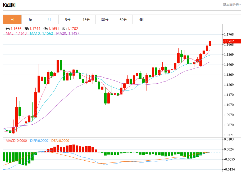 周四盘中,欧元/美元报1.1694,涨幅0.31%。
