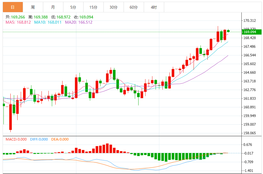 周四,欧元/日元下跌0.12%至169.117附近。