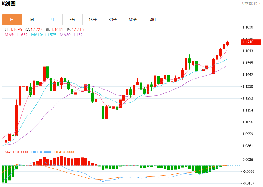 周五盘中,欧元/美元报1.1715,涨幅0.15%。