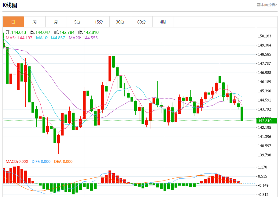 技术点评:RSI技术指标小于中性区域50。 MACD技术指标处在其信号线之下看空。 配置为负。 此外,价位低于其20天及50天移动平均线 ( 分别位于144.29 和144.30 )。
