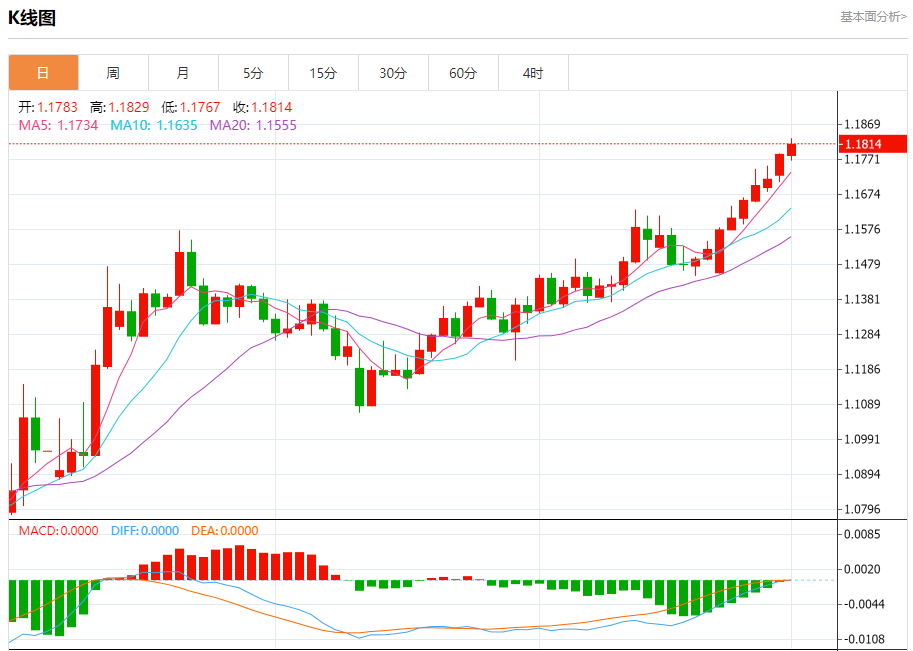 周二盘中,欧元/美元报1.1816,涨幅0.25%。
