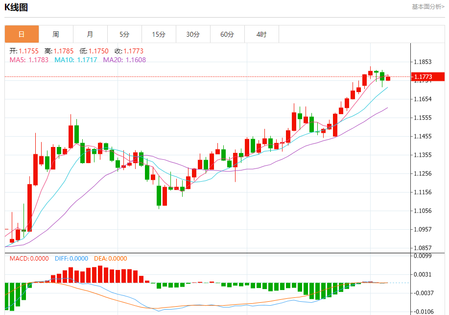 周五盘中,欧元/美元报1.1770,涨幅0.13%。