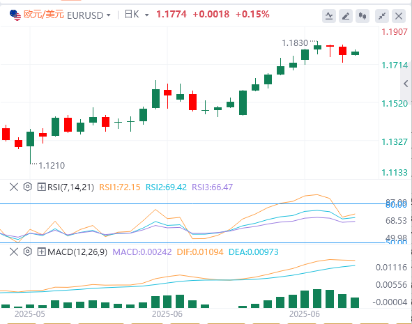 欧元/美元在前两天收于负区间后,保持在1.1750以上的盘整阶段。由于美国金融市场因庆祝7月4日假期而关闭,该货币对的走势在进入周末时可能保持低迷。 美国的乐观就业报告重申了美联储(Fed)将在9月之前不会放松政策的观点,并帮助美元(USD)表现优于其竞争对手。根据CMEFedWatch工具,7月份降息25个基点的概率从劳动市场数据发布前的近25%降至5%以下。 美国劳工统计局宣布,6月份非农就业人数(NFP)增加了147,000人,而市场预期为110,000人。此外,失业率从5月份的4.2%小幅下降至4.1%。此外,供应管理协会(ISM)的服务业采购经理人指数(PMI)从6月份的49.9改善至50.8。因此,美元指数日内上涨近0.4%。 欧洲委员会主席乌尔苏拉·冯德莱恩周四对记者表示,他们准备与美国达成关税协议。然而,她进一步指出,他们正在为“未达成令人满意的协议”的可能性做准备。同时,美国总统唐纳德·特朗普在周四晚些时候表示,他们将从周五开始发送关于贸易关税的信函。 如果市场因欧盟-美国贸易关系的不确定性而保持谨慎,欧元在短期内可能难以找到需求。 欧元/美元技术分析 4小时图上的相对强弱指数(RSI)指标略微在50以上横盘,而欧元/美元在20周期和50周期简单移动平均线(SMA)之间波动,反映出缺乏方向性动能。 在下行方面,1.1760(上升通道的中点)作为立即支撑位,之后是1.1725(50周期SMA)和1.1650(上升通道的下限)。向上看,阻力位可能出现在1.1800(静态水平,整数关口)和1.1860(上升通道的上限)。 |