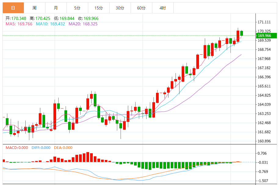 周五,欧元/日元下跌0.26%至169.957附近。