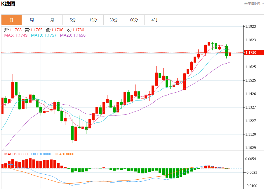 周二盘中,欧元/美元报1.1723,涨幅0.14%。