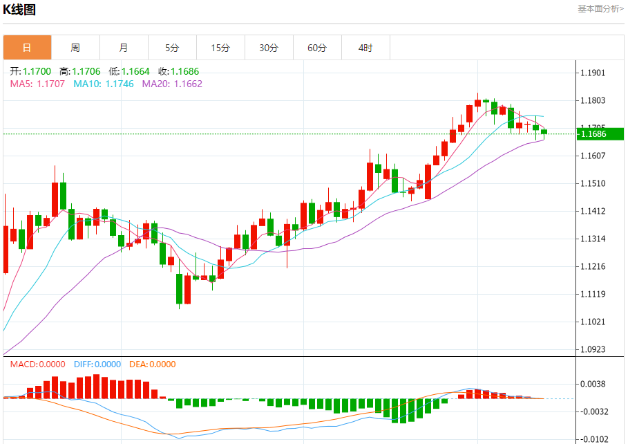 周五盘中,欧元/美元报1.1695,跌幅0.04%。