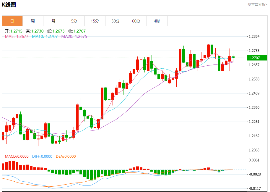 周一盘中,英镑/美元报1.2708,跌幅0.07%。