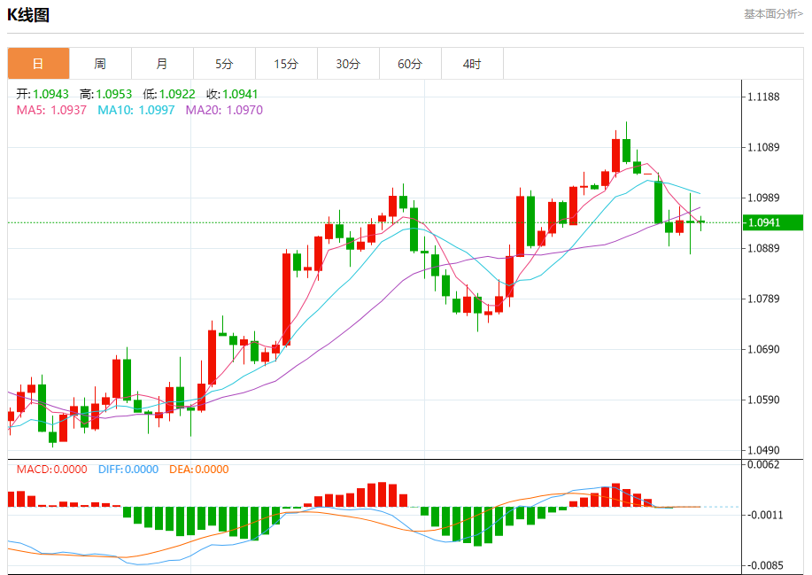 周一盘中,欧元/美元报1.0943,涨幅0.01%。