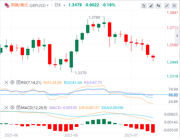 7月14日,英镑本周开局下跌,延续了周五的跌势,兑美元的交易价格为6月23日以来的最低水平。上周末,英国(UK)国内生产总值(GDP)连续第二个月萎缩,引发了对不断膨胀的财政风险的担忧,英镑在上周末受到严重打击。 英国国家统计局(ONS)报告称,5月份经济萎缩了0.1%。然而,下降的速度比4月份0.3%的收缩要温和。工厂产出下降是导致经济增长萎缩的重要原因。 随着财政大臣雷切尔·里夫斯(RachelReeves)增加福利支出法案,英国财政风险最近不断升级,预计到2029-2030财年,政府的财政负担将增加48亿英镑。 与此同时,由于英国6月消费者价格指数(CPI)数据和截至5月的三个月劳动力市场数据将分别于周三和周四公布,投资者为本周英镑的大幅波动做好准备。 投资者将密切关注英国劳动力市场数据,因为招聘和就业联合会(RecruitmentandEmploymentConfederation)贸易机构和会计师事务所毕马威(KPMG)的最新调查表明,个人求职机会已显着增加。据路透社报道,各机构报告称,员工可用性指数从5月份的63.3升至66.1,这是自2020年11月以来的最高读数。 劳动力市场状况降温通常会导致市场对英格兰银行(BoE)降息的预期增加,这种情况对英镑不利。目前,交易员越来越相信英国央行将在8月货币政策会议上将利率下调25个基点(bps)至4%。 周一欧洲交易时段,英镑兑美元(USD)跌至1.3450附近,为三周来的最低水平。在美国(US)和欧盟(EU)之间的贸易紧张局势导致市场情绪紧张之后,由于对风险感知资产的需求减少,英镑/美元货币对下跌。 上周末,美国总统唐纳德·特朗普宣布对欧盟和墨西哥的进口商品征收30%的关税,因为它们未能在90天的互惠关税暂停期内达成贸易协定。特朗普还警告说,如果他们进行报复或宣布反制措施,他将提高关税。 新的关税威胁再次点燃了全球贸易担忧,导致对避险资产的需求增加。在撰写本文时,追踪美元兑六种主要货币价值的美元指数(DXY)在98.00附近徘徊。 本周,将于周二公布的美国6月CPI数据将成为美元的关键触发因素。预计CPI报告将显示价格上涨速度更快。这种情况将使美联储(Fed)官员不敢降低利率。尽管如此,美国总统特朗普一直在批评美联储,特别是其主席杰罗姆鲍威尔,维持限制性货币政策立场。 根据CMEFedWatch工具,美联储在9月份降息的可能性为62.8%。美联储几乎可以肯定,在本月底的政策会议上,将借款利率稳定在目前的4.25%-4.50%区间。 英镑/美元技术分析 英镑/美元周一延续了连跌势头。英镑/美元货币对的近期趋势转为看跌,因为它跌破20天和50天指数移动平均线(EMA),分别在1.3573和1.3480附近交易。 14天相对强弱指数(RSI)跌至40.00附近。如果RSI跌破该水平,将出现新的看跌势头。 向下看,6月23日的低点1.3370将成为关键支撑区域。从好的方面来看,1.3800附近的三年半高点将成为关键障碍。 |