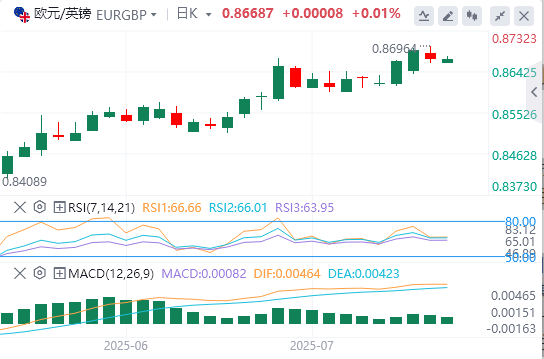 7月16日,欧元/英镑在周三欧洲早盘时段在0.8675附近的积极区域交投。然而,在英国消费者价格指数(CPI)通胀报告发布后,英镑(GBP)兑欧元(EUR)收复了一些失地。交易员正等待美国生产者物价指数(PPI),随后是周三晚些时候公布的美联储褐皮书和工业生产数据。 英国国家统计局周三公布的数据显示,该国6月份整体CPI同比增长3.6%,而5月份的涨幅为3.4%。这一读数高于市场普遍预期的3.4%。剔除波动较大的食品和能源价格的核心CPI6月同比上涨3.7%,高于预期的3.5%,高于预期的3.5%。 与此同时,英国月度CPI通胀率从5月份的0.2%升至6月份的0.3%,市场预计该读数将增长0.2%。英镑吸引了一些买家,对更热门的英国CPI通胀数据做出了即时反应。 美国与欧盟(EU)之间再度的贸易紧张局势可能会限制欧元的上行空间。《华尔街日报》周二报道称,欧盟正在准备对价值720亿欧元(840亿美元)的美国商品征收关税,以防在8月1日之前无法达成贸易协议。这一行动是在特朗普威胁从8月初开始对从欧盟和墨西哥进口的商品征收30%关税之后采取的。 交易员将密切关注美欧贸易协议的事态发展。美国对来自欧盟的进口商品征收更高的关税将进一步削弱欧元区的增长,并可能促使欧洲央行(ECB)降低借贷成本。反过来,这可能会在短期内拖累共享货币走低。