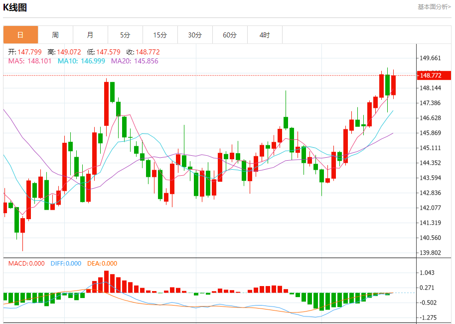 周四盘中,美元/日元报148.793,涨幅0.67%。