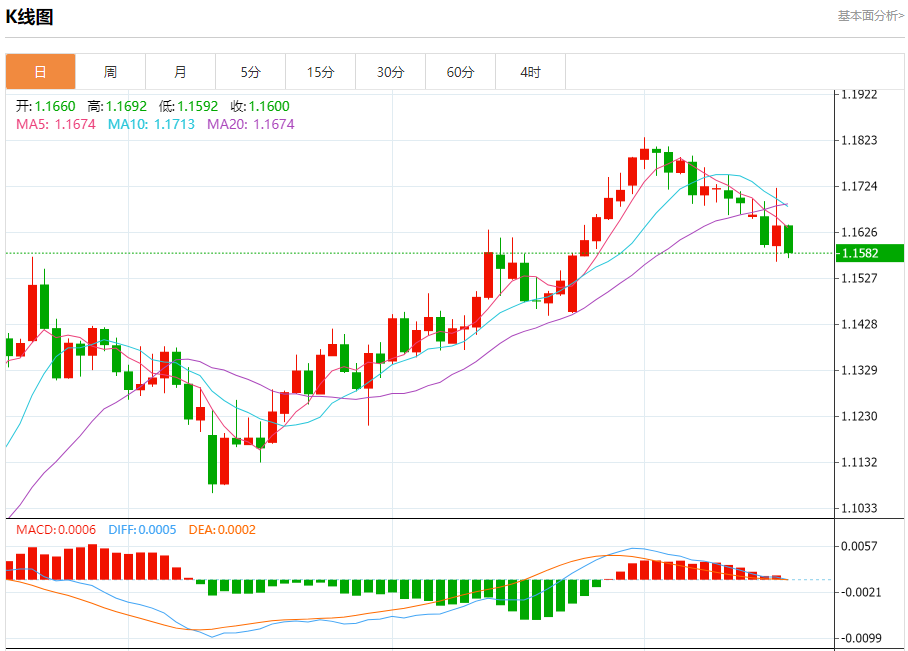 周四盘中,欧元/美元报1.1580,跌幅0.55%。