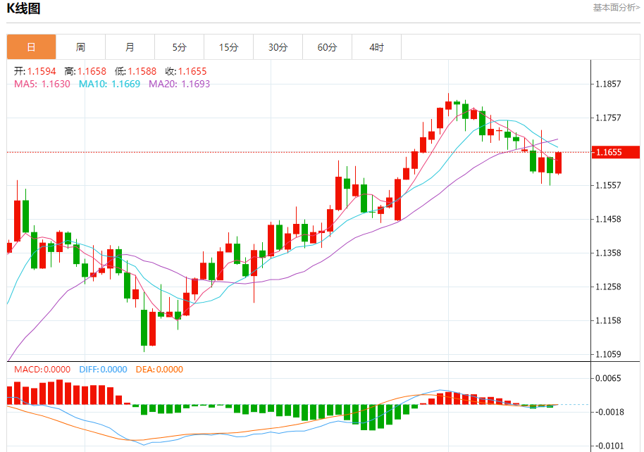 周五盘中,欧元/美元报1.1647,涨幅0.45%。