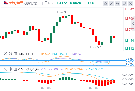 7月22日,周二欧洲交易时段,英镑/美元在1.3500附近普遍横盘整理。英镑/美元货币对小幅下跌,因为美元在周一的修正走势后上涨。 截至撰写本文时,追踪美元兑六种主要货币价值的美元指数(DXY)在98.00下方找到缓冲。美元指数从99.00附近的四周高点回撤。 随着美国总统唐纳德·特朗普8月1日关税最后期限临近,华盛顿已与少数国家达成交易,投资者为美元的大幅波动做好准备。此外,预计美国在剩余时间内不会与其贸易伙伴达成双边协议。 到目前为止,美国已经宣布了与英国(UK)、越南和印度尼西亚的贸易协议,以及与中国的有限协议。华盛顿已致函22个国家,特别是日本、越南、加拿大、墨西哥和欧盟(EU)。 周一,美国财政部长斯科特·贝森特表示,华盛顿在谈判方面更强调“质量”而不是“时机”。“这里重要的是交易的质量,而不是交易的时机,”贝森特周一在接受CNBC采访时说。 与此同时,美国和欧盟之间贸易紧张局势的新一轮升级可能会打压美元。欧盟官员发誓要对特朗普威胁的征税进行报复。上周末,《华尔街日报》(WSJ)的一份报告表明,美国总统正在考虑将基线关税税率从之前规定的10%提高到15%至20%之间。 英镑兑主要货币周二表现出稳定性,投资者等待定于周四发布的英国(UK)7月份标准普尔全球采购经理人指数(PMI)初步数据。 投资者将密切关注英国PMI数据,以了解招聘放缓的影响是否已经开始影响经济。预计该报告将显示整体商业活动温和增长。预计综合采购经理人指数将从6月份的52.0小幅下降至51.9。 在雇主加速向社会保障计划供款的有效性之后,英国雇主限制了新员工招聘,以抵消增加的员工成本。 与此同时,市场对英国央行(BoE)在下个月的货币政策公告中的利率决定的预期将成为英镑的关键触发因素。英国央行几乎肯定会将利率下调25个基点(bps)至4%。 在周二的交易中,投资者将关注英国央行行长安德鲁·贝利(AndrewBailey)格林威治标准时间09:15在财政部特别委员会就7月金融稳定报告的证词。贝利不太可能就货币政策前景提供指导。 在美国,交易员下调了对美联储在9月会议上降息的预期。 上周公布美国6月消费者价格指数(CPI)数据后,交易员减少了美联储的鸽派押注,该数据显示,在唐纳德·特朗普征收部门关税后,主要进口产品的价格有所上涨。 英镑/美元技术分析 周二,英镑/美元在前一天的1.3470附近震荡。英镑/美元货币对的近期趋势看跌,因为它在1.3500附近的20天指数移动平均线(EMA)附近复苏后面临抛售压力 14天相对强弱指数(RSI)努力保持在40.00水平上方。如果RSI跌破该水平,将出现新的看跌势头。 向下看,5月12日低点1.3140将成为关键支撑区域。从好的方面来看,7月11日高点1.3585附近将成为关键障碍。