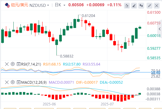 7月24日,周四亚市盘中,纽元/美元在0.6055附近的积极区域交易,受到风险情绪改善的提振。交易员将密切关注中美贸易协议的前景,这些协议可能会改善全球经济前景。 据路透社报道,美国总统唐纳德·特朗普周二宣布与日本达成贸易协议,将汽车进口关税降至15%,以换取价值5500亿美元的一揽子美国投资和贷款。这些积极的发展提振了风险较高的货币,例如纽元/美元。 然而,特朗普关税的不确定性让市场保持紧张。美国财政部长贝森特表示,他将于下周在斯德哥尔摩与中国官员会面,讨论延长贸易协议谈判的最后期限。 如果没有贸易协议或延长谈判时间,美国的关税可能会恢复到145%,中方的关税可能会恢复到125%。任何贸易紧张局势重新出现的迹象都可能对中国代理新西兰造成一些抛售压力,因为中国是新西兰的主要贸易伙伴。 此外,新西兰储备银行(RBNZ)降息预期上升可能会导致纽元下跌。周一公布的数据显示,新西兰第二季度(Q2)的年度通胀率升至一年来的最高水平,但低于市场共识。市场已消化8月份降息25个基点(bps)的可能性为80%,尽管投资者认为宽松周期可能已接近尾声。 周四晚些时候,美国7月采购经理人指数(PMI)数据的初值将成为焦点。此外,每周美国初请失业金人数、新屋销售和芝加哥联储全国活动指数也将公布。如果报告显示的结果弱于预期,这可能会打压美元并成为该货币对的顺风。 |