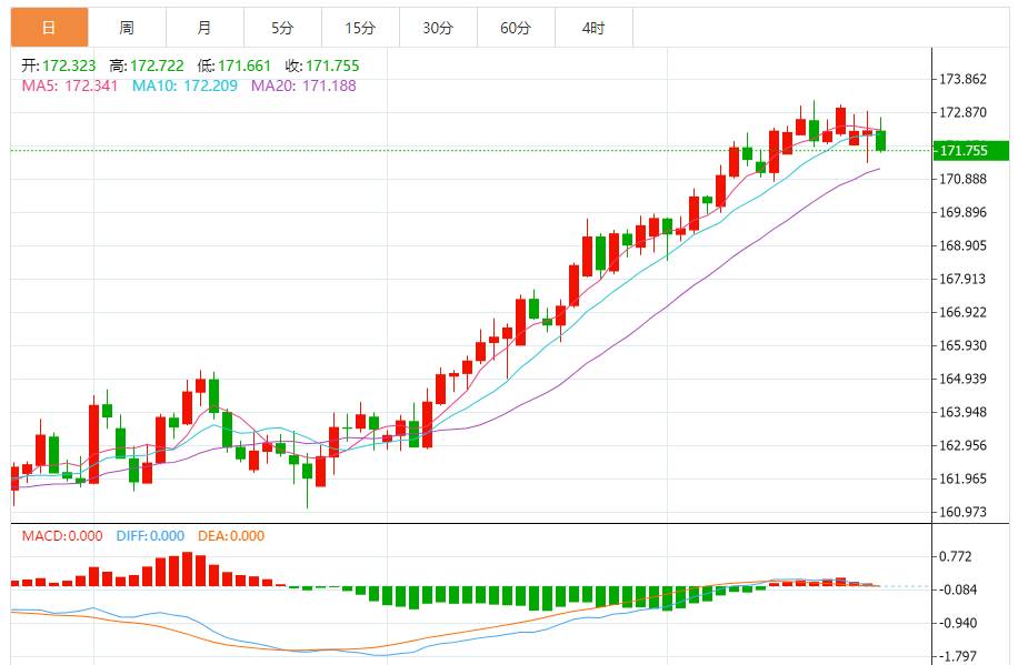 今天的预期交易区间:在171.45支撑和173.85阻力之间。