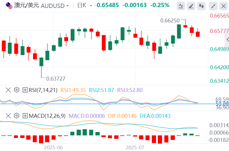 7月28日,周一欧市盘中,澳元/美元下跌,连续第三个交易日延续跌势。然而,在美国(US)和欧盟(EU)宣布新建立的贸易协定后,澳元/美元货币对上涨。 交易员等待美国财政部长斯科特·贝森特与中国副总理何立峰定于周一在斯德哥尔摩举行的会晤的进一步进展。据《南华早报》(SCMP)周日援引消息人士的话称,预计两国将把关税休战再延长三个月。 英国《金融时报》报道称,美国已冻结对中国关键技术的出口管制,以期保持贸易关系更加顺畅。值得注意的是,中国经济的任何变化都可能影响澳元,因为中国和澳大利亚是密切的贸易伙伴。 澳大利亚第二季度CPI数据将在周三受到关注,因为该数据对于澳大利亚储备银行的下一届利率决定至关重要。澳洲联储行长米歇尔·布洛克上周承诺确保未来通胀保持低位和稳定。布洛克还指出,全球经济持续存在不确定性。 美国和欧盟周日达成框架贸易协议,对大多数欧洲商品征收15%的关税,并于8月1日生效。据彭博社报道,这笔交易结束了长达数月的僵局。 上周美国初请失业金人数降至217,000人,低于前几周的227,000人和221,000人。这标志着连续第六周下跌,是自2022年以来最长的连续下跌,凸显了劳动力市场的韧性。 标准普尔全球美国综合采购经理人指数(PMI)初值从6月的52.9升至7月份的54.6,表明整体商业活动的增速为七个月来最快。服务业采购经理人指数升至55.2,高于预期的53.0,反映出服务业需求强劲。然而,制造业采购经理人指数降至49.5,低于前值52.0,低于预期的52.5,滑入收缩区间。 美国财政部长斯科特·贝森特指出,下一任美联储主席的提名人选可能会在12月或1月公布。据彭博社报道,贝森特强调,“不急于”选择现任美联储主席杰罗姆·鲍威尔的继任者,并指出提名人可能来自现任董事会成员或地区银行负责人。 美联储理事阿德里亚娜·库格勒早些时候表示,美联储不应“在一段时间内”降息,因为特朗普政府关税的影响开始体现在消费者价格上。库格勒补充说,限制性货币政策对于保持通胀心理至关重要。 旧金山联储主席戴利表示,预计今年降息两次是一个“合理”的前景,同时警告不要等待太久。美联储理事克里斯托弗·沃勒认为,美联储应该在7月会议上降低利率目标。 澳大利亚储备银行(RBA)最新的会议纪要显示,董事会同意随着时间的推移需要进一步降息,注意力集中在宽松的时机和程度上。大多数人认为最好等待通胀放缓的确认后再放松。大多数成员认为,在四次会议上三次降息不会是“谨慎和渐进的”。 澳元/美元技术分析 周一澳元/美元交投于0.6570附近。日线图的技术分析表明,由于该货币对仍处于上升通道形态内,因此普遍存在看涨倾向。14天相对强弱指数(RSI)位于50关口上方,强化了看涨倾向。此外,该货币对仍高于九天指数移动平均线(EMA),表明短期价格势头更强劲。 从好的方面来看,澳元/美元货币对可能会瞄准八个月高点0.6625的初始障碍。突破该水平将支持该货币对接近上升通道的上限0.6680附近。 澳元/美元货币对可能会测试其主要支撑位0.6560的9日均线。跌破该水平可能会削弱短期价格势头,并给该货币对带来下行压力,以测试50日均线0.6508,随后是上升通道的下边界0.6490附近。