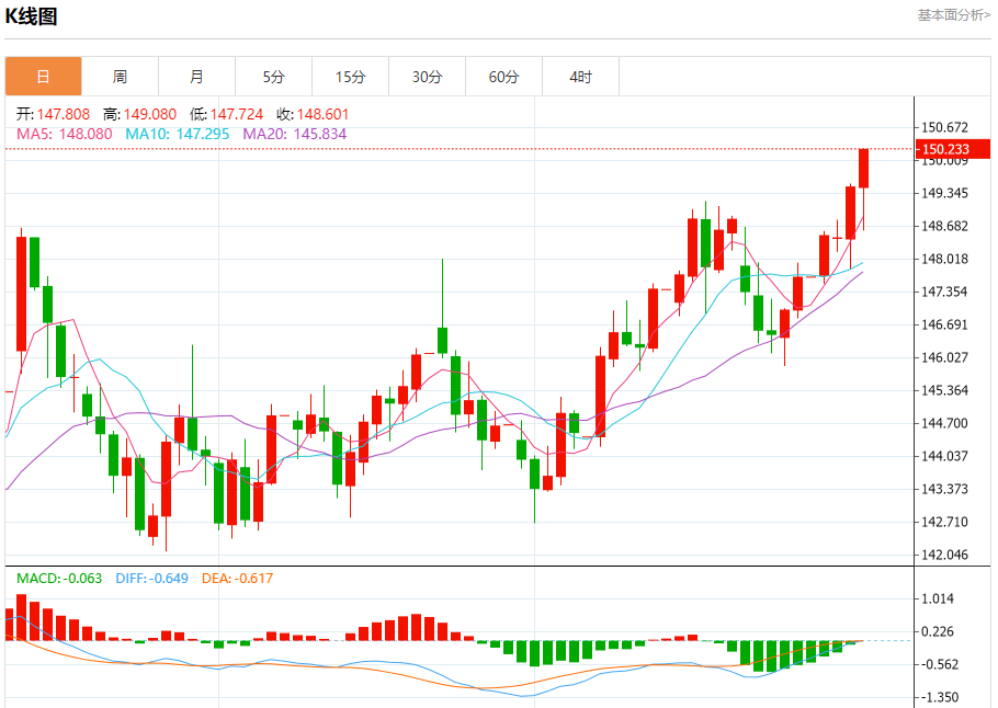 周四盘中,美元/日元报150.237,涨幅0.50%。