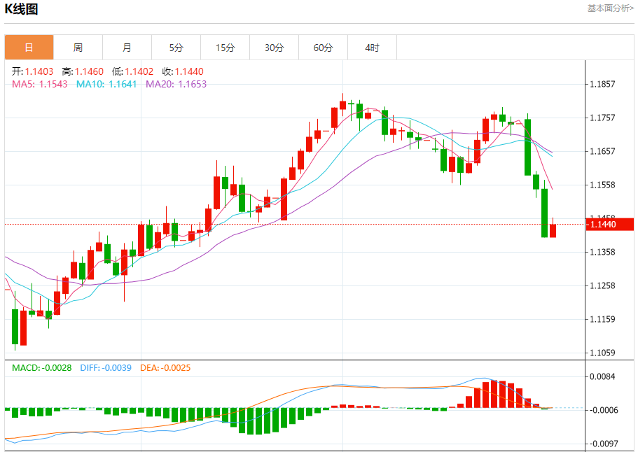 周四盘中,欧元/美元报1.1431,涨幅0.25%。