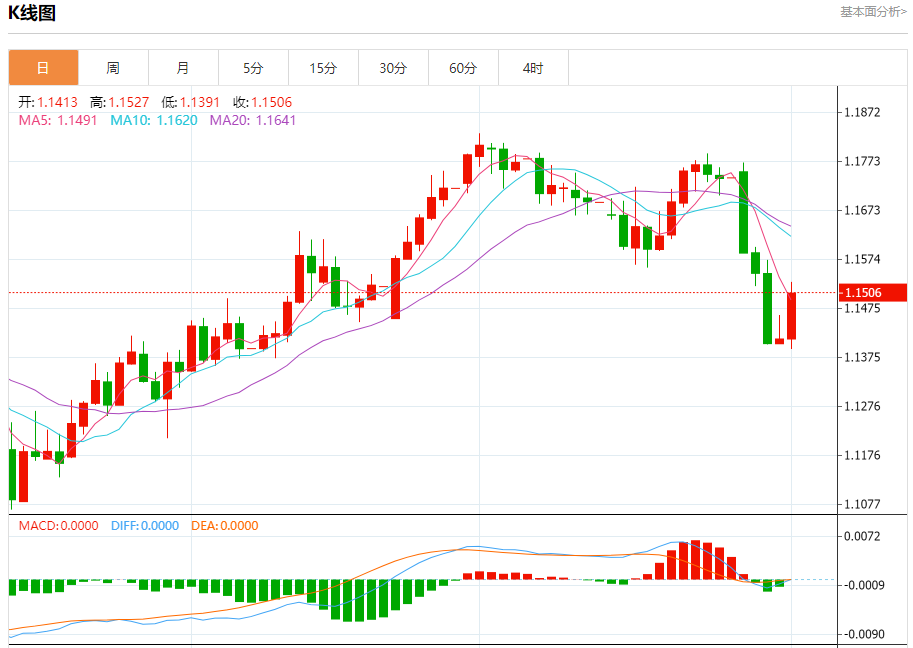 周五盘中,欧元/美元报1.1531,涨幅1.03%。