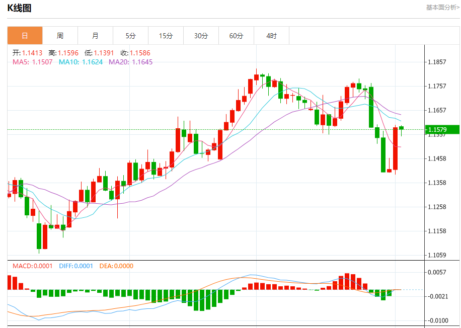 周一盘中,欧元/美元报1.1585,跌幅0.01%。