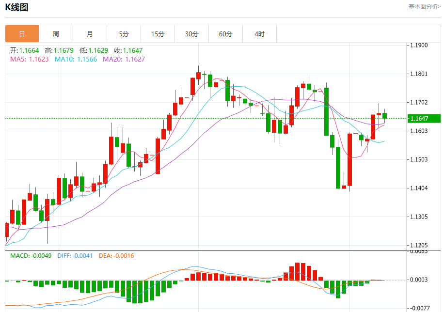 周五盘中,欧元/美元报1.1648,跌幅0.15%。