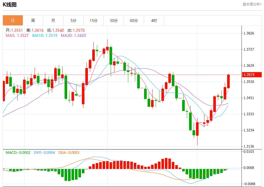 周三盘中,英镑/美元报1.3568,涨幅0.53%。