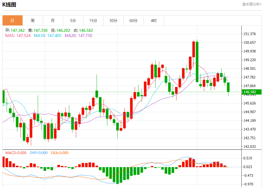 周四盘中,美元/日元报146.501,跌幅0.58%。
