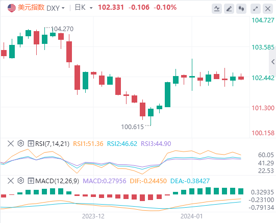 美元指数显示,美元回吐年初录得的部分涨幅,上周维持震荡行情,仅维持在102.00支撑位上方。 事实上,本周美元总体维持震荡,各个周期美债收益率同样方向不明,而在1月11日最受关注的美国消费者物价指数(CPI)通胀数据公布之前,市场猜测不断升温。消费者物价指数一经公布,2023年最后一个月消费者物价年率意外上升,进而导致美元指数开盘跳涨至102.80区间,不过随着时间的推移以及美联储最快将于3月降息的预期总体不变,这一走势也随之消退。 到目前为止,芝加哥商品交易所美联储观察工具显示,出现这种情况的概率徘徊在80%左右,高于一周前的近65%。 尽管与欧洲央行(ECB)、英国央行(BOE)和澳大利亚储备银行(RBA)相比,美联储被认为是最先开始考虑降低基准利率的主要央行之一,但美元坚挺下跌并非板上钉钉的事,尤其是考虑到美国经济的韧性日益增强(在过去几个月中主要受到稳健基本面的影响),当我们审视劳动力市场有增无减的紧张程度时,这种韧性达到了最高水平。 进入本周后,美联储政策依赖经济数据的立场将再次受到考验,本周将公布零售销售、工业生产、每周初请失业金人数、费城联储制造业指数、消费者信心初值和住房部门读数等重要数据。 美元指数技术展望 从日线图看,美元指数预计将在迄今为止的年内高点103.10(1月5日)面临直接阻力,,然后是位于关键的200日均线103.42,该区域也与过渡性55日简单移动均线汇合。进一步上行后美元指数将面临12月份高位104.26(12月8日和11日),然后是中期均线100日均线104.41。若美元指数突破周线高位106.10(11月10日),将为测试11月高点107.11(11月1日)铺平道路。 如果空头重新占据主导,迫使美元指数跌破目前维持盘整区间,那么在12月低点100.61(12月28日)之前不存在关键水平。如果美元指数跌破该区域,可能会踏上下行之路,跌至2023年底部99.57(7月14日),但要始终牢记100.00这一心理关口并不牢固。 值得注意的是:日图相对强弱指标维持下降趋势与当前的区间震荡交易相匹配,甚至可能允许美元指数近期走弱。