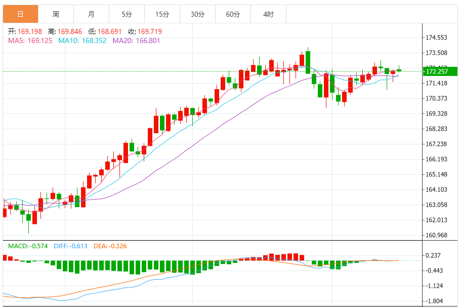 今天的预期交易区间:在172.00至173.55之间