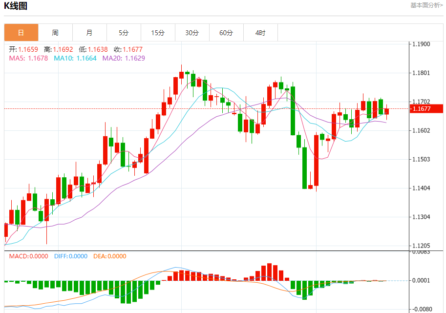周二盘中,欧元/美元报1.1678,涨幅0.15%。