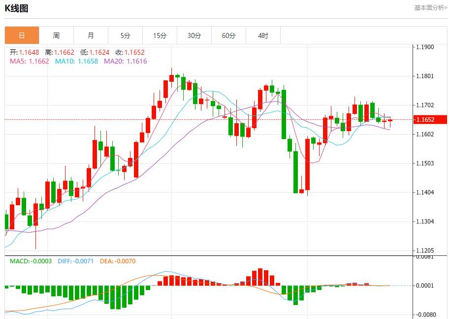 周四盘中,欧元/美元报1.1652,涨幅0.02%。