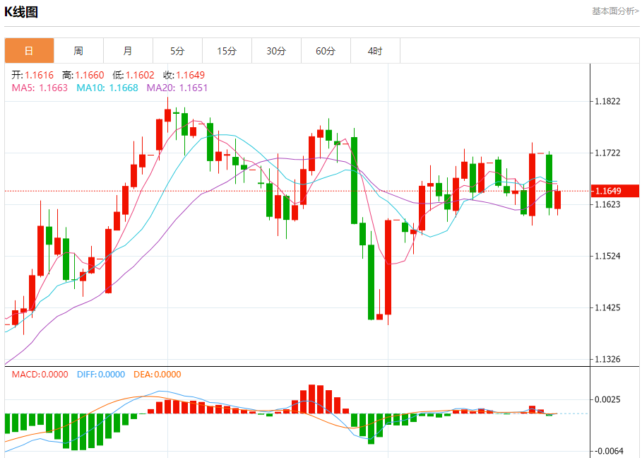 周二盘中,欧元/美元报1.1646,涨幅0.25%。