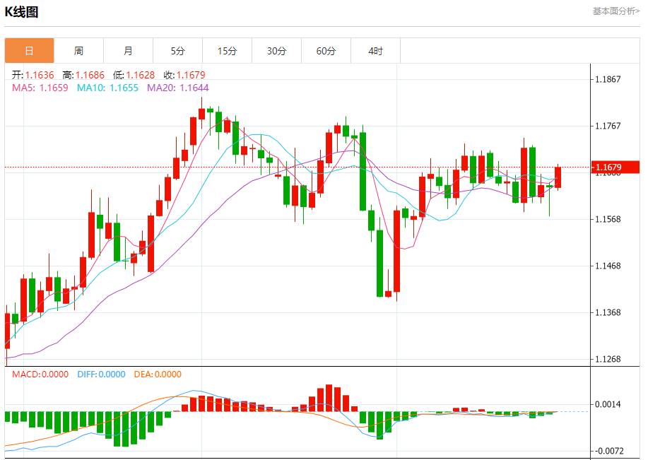 周四盘中,欧元/美元报1.1682,涨幅0.37%。
