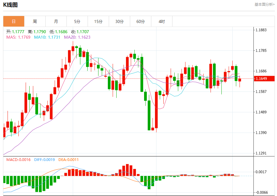 周三盘中,欧元/美元报1.1644,涨幅0.06%。