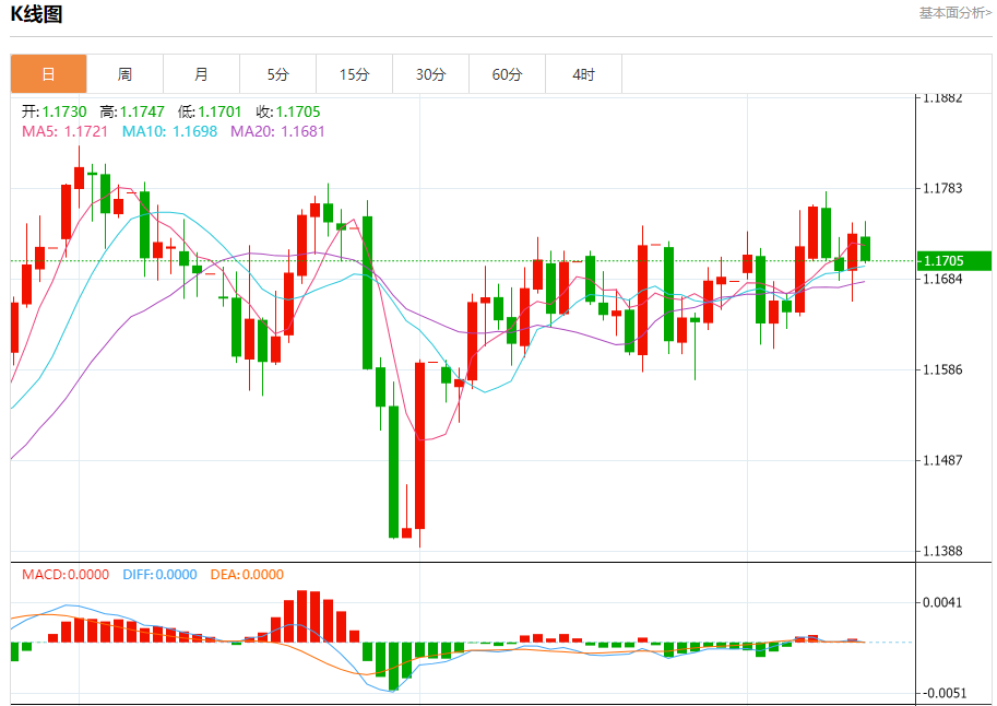周五盘中,欧元/美元报1.1711,跌幅0.20%。