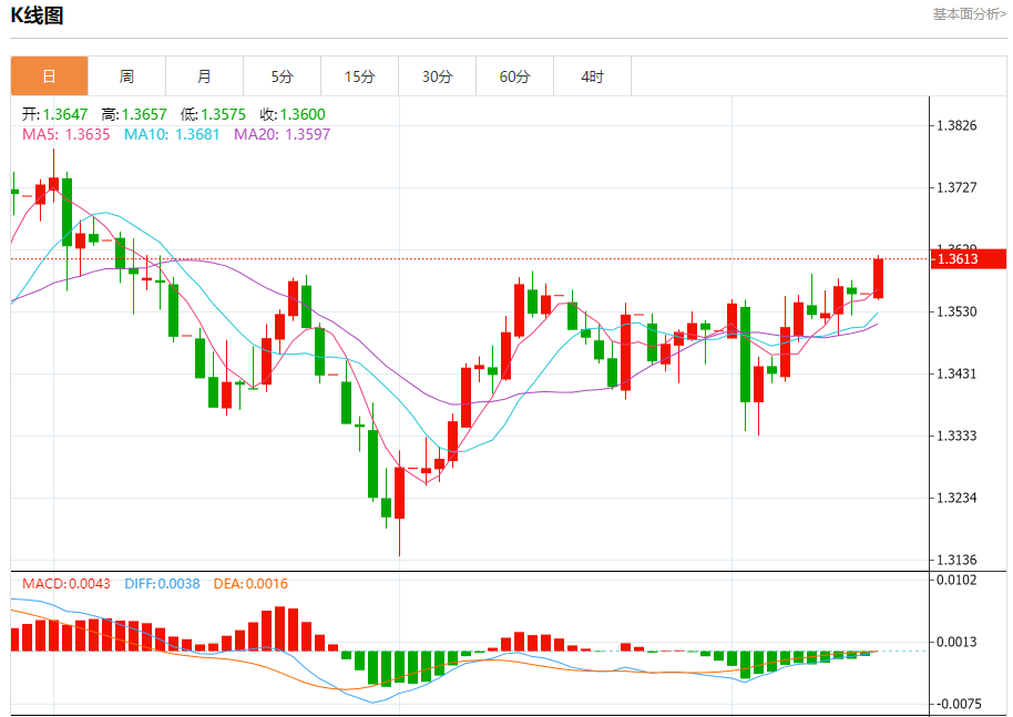 周一盘中,英镑/美元报1.3611,涨幅0.38%。