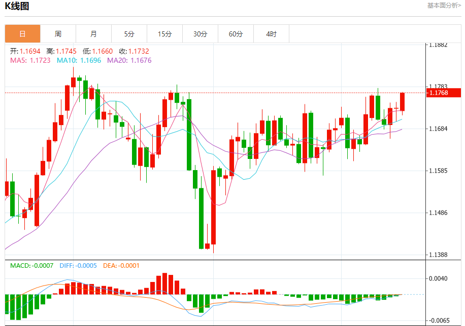 周一盘中,欧元/美元报1.1771,涨幅0.35%。