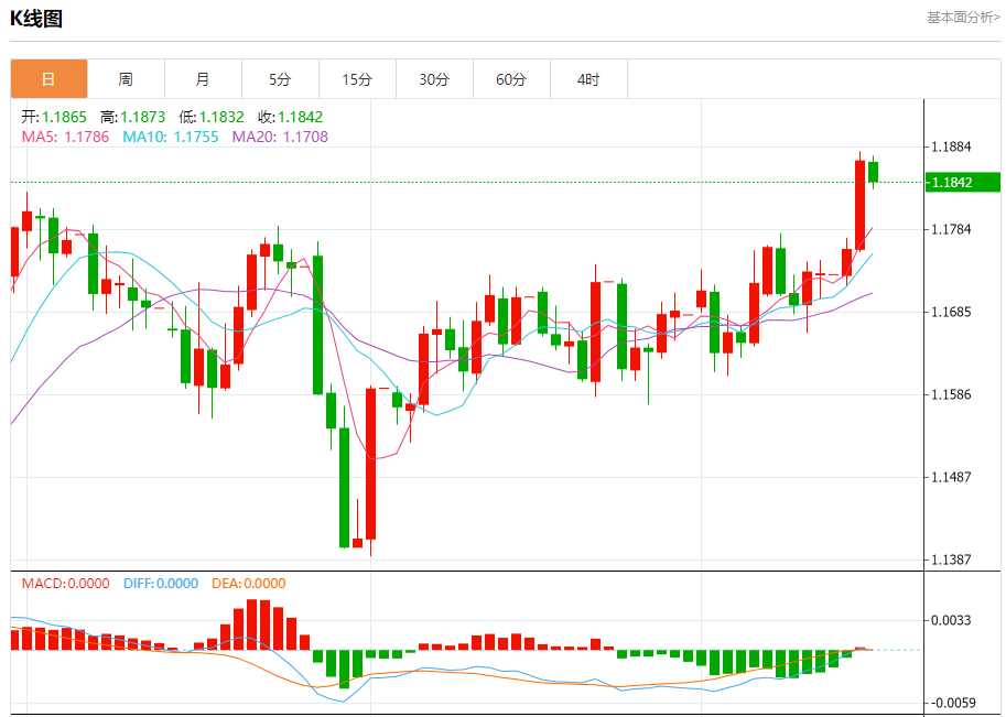 周三盘中,欧元/美元报1.1846,跌幅0.18%。