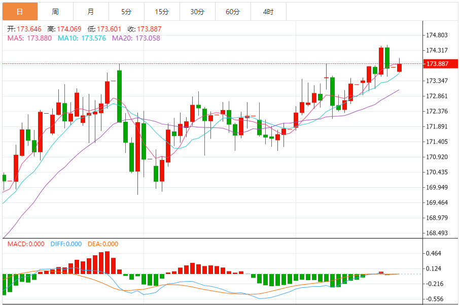 今天的预期交易区间:在173.40到175.20之间