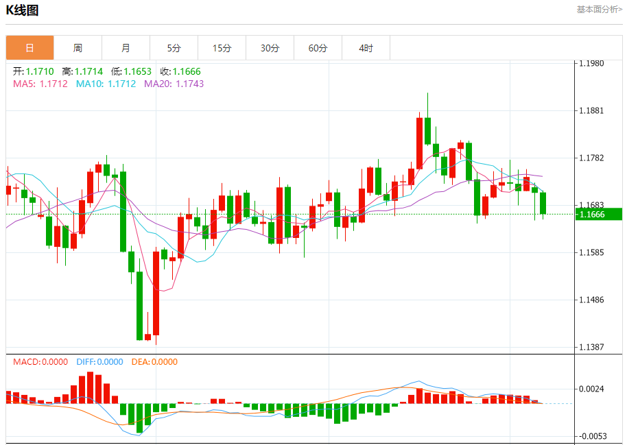 周二盘中,欧元/美元报1.1668,跌幅0.36%。