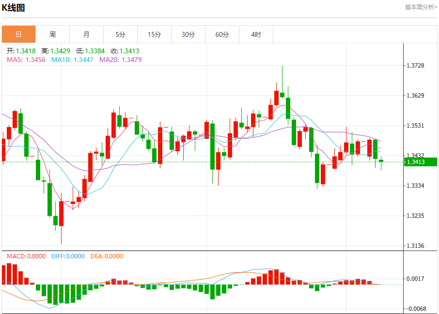 周三盘中,英镑/美元报1.3415,跌幅0.06%。