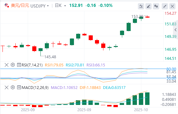 10月10日,日元兑美元在周五亚洲时段触及2月13日以来的新低后小幅回升,但上行潜力似乎有限。市场参与者一直在猜测,在上周六执政的自民党(LDP)党魁选举出现意外结果后,高市早苗将推出更宽松的财政政策。这可能会进一步推迟日本央行(BoJ)的紧缩计划,而这反过来又是本周初以来日元暴跌的关键因素。 然而,在通胀粘性和经济弹性的情况下,日本央行今年再次加息的押注仍然悬而未决。这与股市的疲软基调一起,被认为为避险货币日元提供了一些支撑。另一方面,美元巩固了其强劲的周涨幅至8月初以来的最高水平,并有助于限制美元/日元货币对。尽管如此,上述基本面背景使得谨慎的做法是等待强劲的后续买盘,然后再确认日元在短期内触底并押注看涨。 上周六,高市早苗在执政的自民党党魁竞选中出人意料地获胜后,对日本财政健康的担忧加剧,对日本央行立即加息的预期也黯淡了。这一结果使她有望成为该国第一位女总理,并引发了人们对更多扩张性财政政策的猜测。 高市被视为前首相安倍晋三经济政策的支持者,安倍晋三主张大开支和货币刺激来支持日本经济。预计高市还将反对日本央行进一步收紧政策,这反过来又是日元自本周初以来普遍表现不佳的关键因素。 与此同时,日本的通胀率三年多来一直保持在或高于日本央行2%的目标,在截至6月的三个月里,日本经济连续第五个季度扩张。此外,高市的经济顾问——如本田悦郎和相田拓司——被引述说,日本新首相可能会容忍12月或1月再次加息。 此外,高市表示,她不想引发本币过度下跌,这为日元多头在周五亚洲时段提供了一些喘息的机会。除此之外,亚洲股市的谨慎基调帮助避险货币日元从本周五早些时候兑美元触及的2月13日以来的最低水平小幅回升。 在日本和法国持续的政治动荡中,追踪美元兑一篮子货币的美元指数(DXY)周四飙升至两个多月高点。美元多头似乎没有受到美联储今年再降息两次的押注上升以及对美国政府长期关门可能影响经济表现的担忧的影响。 政府关门现已进入第二周,在推进资助法案的协议方面几乎没有进展迹象,参议院周四第七次否决了推进竞争法案的动议。参议院将不会举行任何进一步的投票,停摆将至少延长到下周,届时上议院预计将于周二返回。 周五的美国经济日程将在北美时段晚些时候发布密歇根大学消费者信心指数。除此之外,有影响力的联邦公开市场委员会成员的言论将推动美元上涨,并为美元/日元货币对提供一些动力,美元/日元有望实现强劲的周涨幅,并创下自1月底以来的最高周收盘价。 美元/日元技术分析 隔夜收盘价高于153.00关口,是近期突破151.00关键关口的基础,支持美元/日元进一步上涨的理由。然而,每日相对强弱指数(RSI)略有超买状态,阻碍多头进行新的押注。尽管如此,更广泛的技术设置表明,现货价格阻力最小的路径仍然是上行,任何修正性回调都可能被视为152.60-152.55区域附近的买入机会。这应该有助于限制152.00整数关口附近的下行空间。 另一方面,任何进一步的上涨都可能在153.70-153.75区域附近遇到一些阻力。紧随其后的是154.00大关,高于该关口,美元/日元货币对可能会加速向154.70-154.80区域(2月11日波动高点)迈进,并收复155.00心理关口。 |
