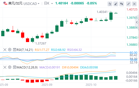 10月10日,美元/加元在前一交易日触及六个月高点1.4033后几乎没有波动,周五亚洲时段交投于1.4020附近。周四,该货币对上涨约0.5%,因为与大宗商品挂钩的加元(CAD)在原油价格下跌的情况下面临挑战。 油价下跌给加元带来下行压力,因为加拿大是美国最大的石油出口国。截至撰写本文时,西德克萨斯中质原油(WTI)油价约为每桶61.20美元。在以色列和哈马斯最近就停火计划的第一阶段达成协议后,地缘政治风险溢价下降,油价承压。 随着美元(USD)停止连续四天的上涨,美元/加元小幅走低。然而,随着政府持续关门导致避险情绪加剧,美元上涨,该货币对可能会进一步升值。美国参议院周五在结束政府关门的立法问题上仍陷入僵局。 然而,由于围绕美联储(Fed)政策前景的鸽派情绪普遍存在,美元可能面临挑战。旧金山联储行长玛丽·戴利周五表示,通胀率远低于她担心的。戴利进一步表示,美联储预计将进一步削减风险管理。 美联储行长迈克尔·巴尔表示,目前的前景对判断货币政策立场和决定正确的前进道路提出了挑战。巴尔还指出,美联储9月份的降息是适当的,当前的政策利率仍具有适度的限制性。他补充说,目前很难判断联邦政府关门是否会在整体经济上留下印记。 |