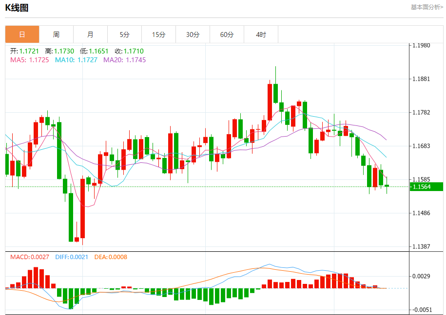周二盘中,欧元/美元报1.1563,跌幅0.05%。
