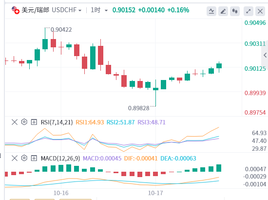 10月17日,周二欧市盘前,美元/瑞郎中断两日连跌。美债殖利率回升为美元/瑞郎提供了一些支撑。截至发稿时,美元/瑞郎交投於0.9011附近,持稳走高,日内涨幅为0.12%。 ![]() |