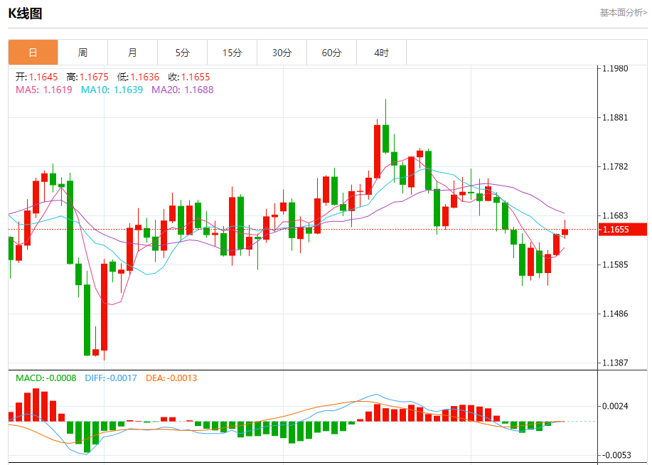周四盘中,欧元/美元报1.1655,涨幅0.08%。