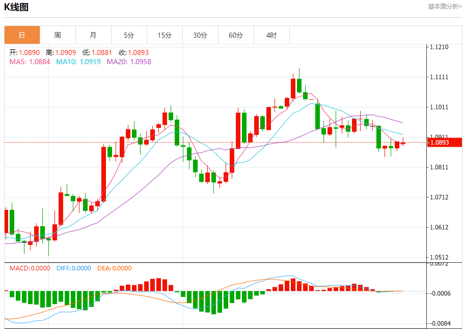 周一盘中,欧元/美元报1.0895,跌幅0.02%。