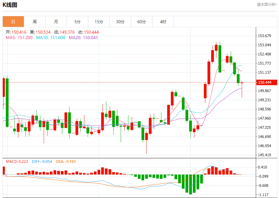 周五盘中,美元/日元报150.376,跌幅0.04%。
